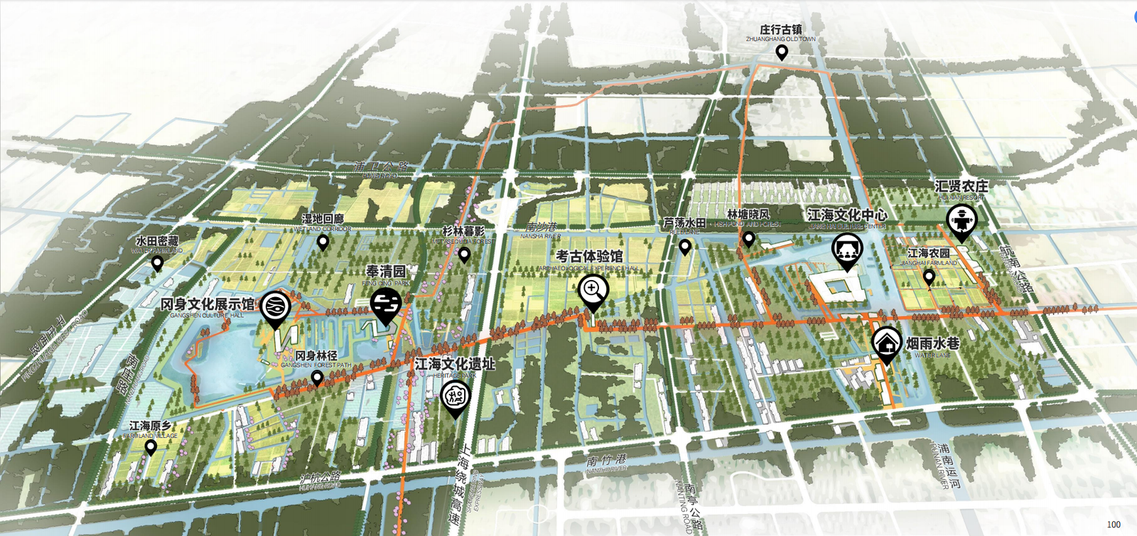 Local cultural resources, such as Jianghai culture and Gangshen historical sites, are incorporated across eight themed zones.