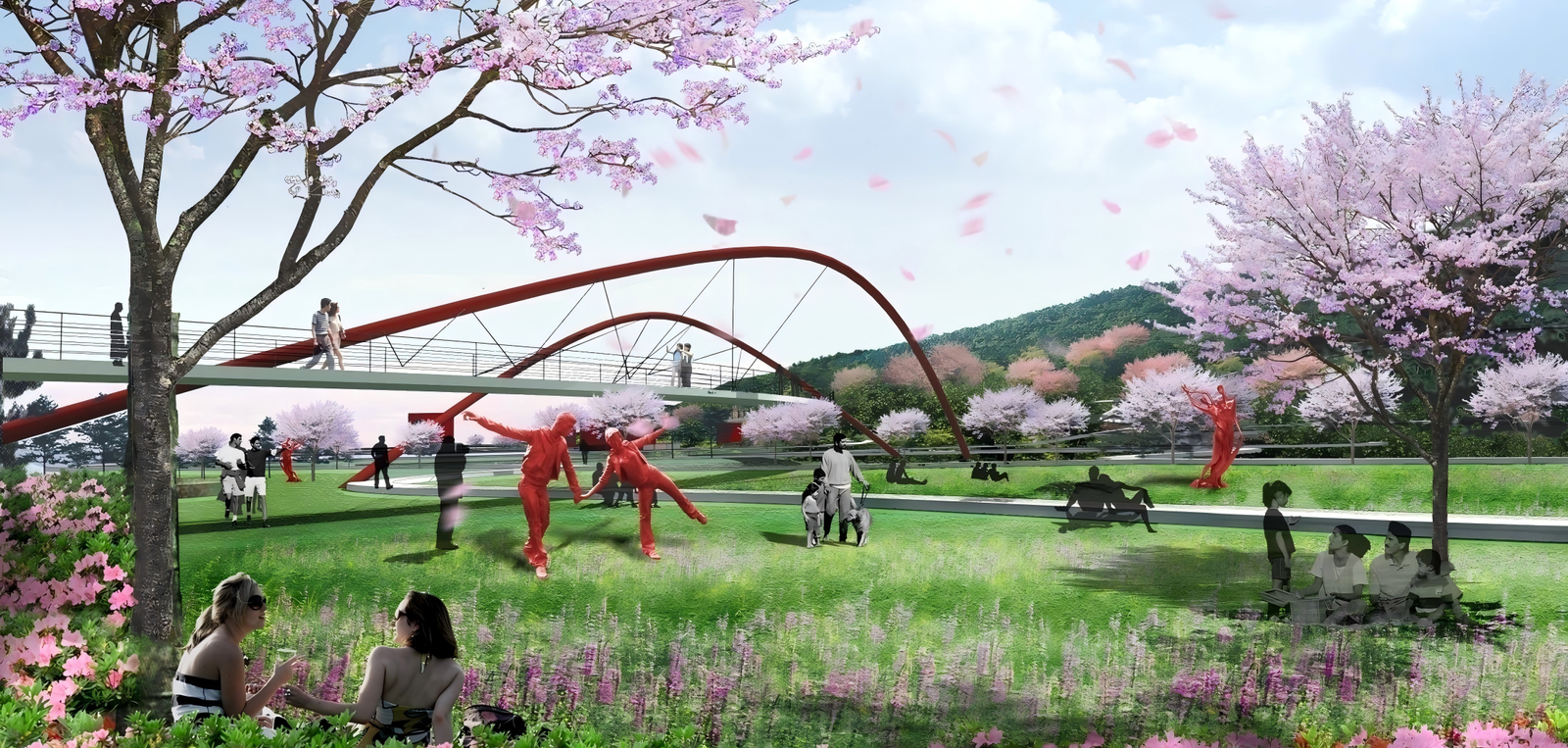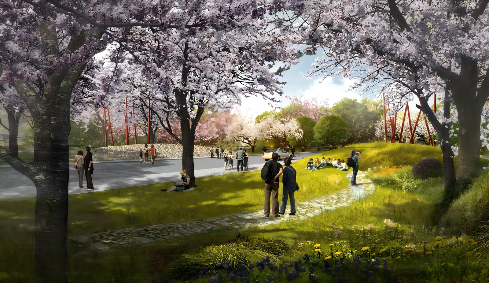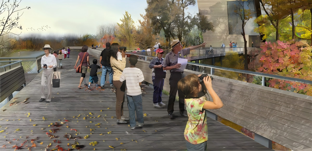 A multi-level road system is designed to connect cycling, hiking, and shuttle networks, enhancing accessibility.