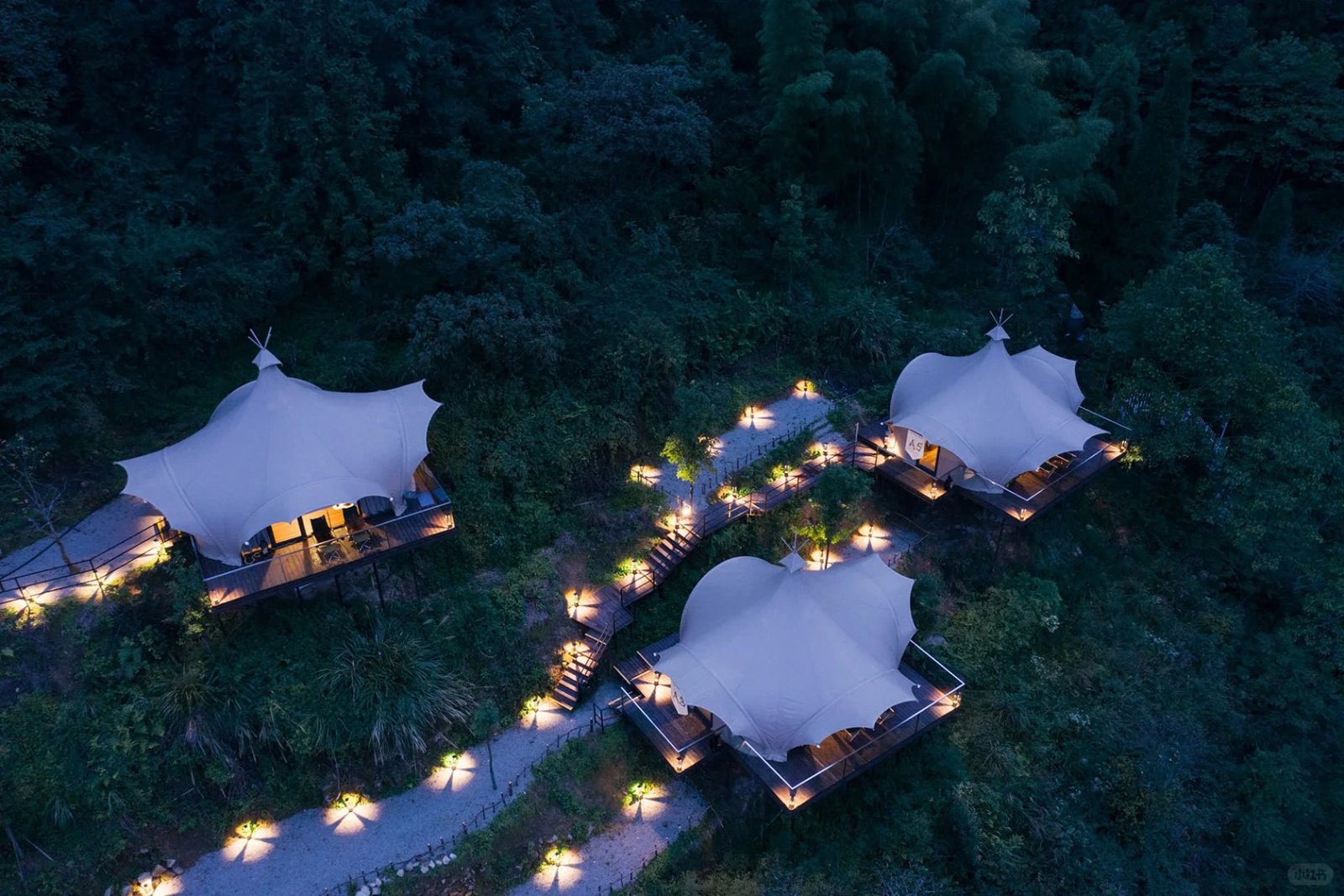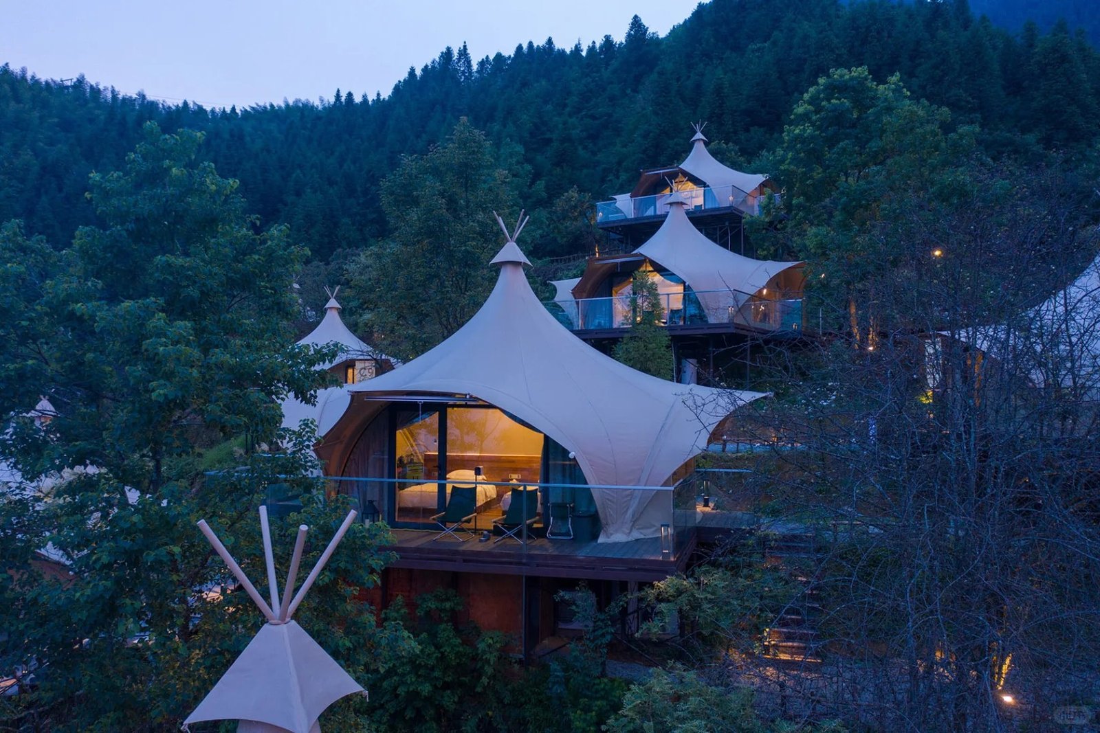 Travelers staying here can fully immerse themselves in the mountains: lying freely amid the forests, taking shelter from wind and rain under a tent, and enjoying essential living facilities—all while sleeping in harmony with the creatures that inhabit this land.