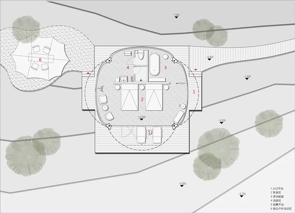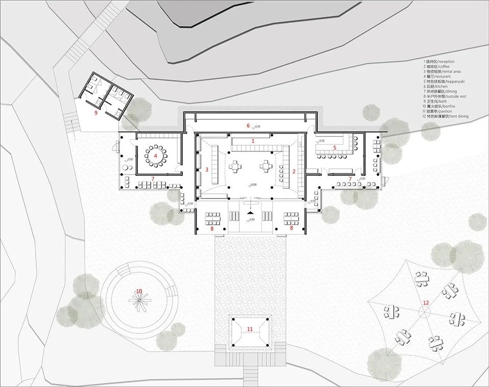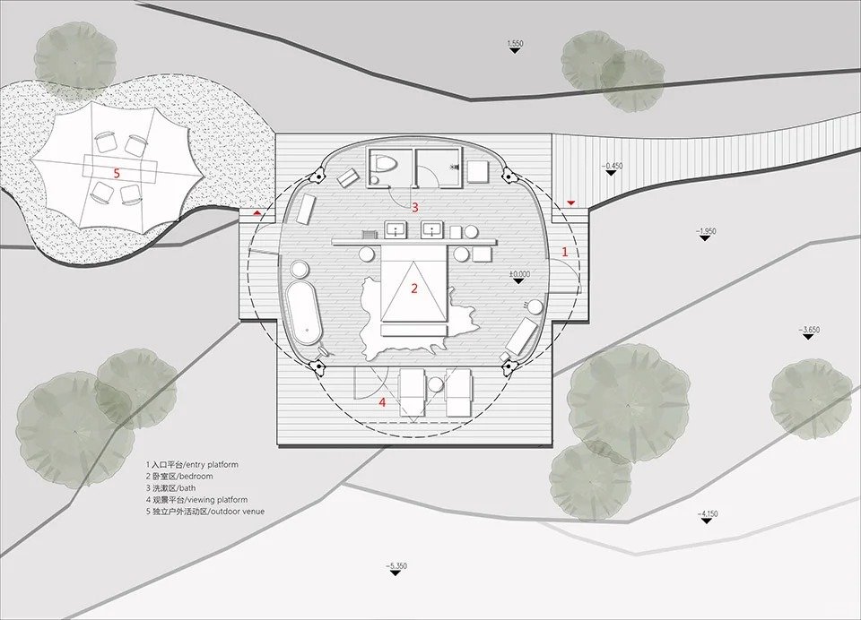 Built upon the renovation of existing buildings and mountainous terrain, we have adopted a “leave-no-trace” design concept for the entire campsite. This includes refraining from land hardening, constructing boardwalks that hover above shrubs, using lightweight, open tents, preserving the original vegetation, maintaining the existing ecology, and using restrained nighttime lighting.