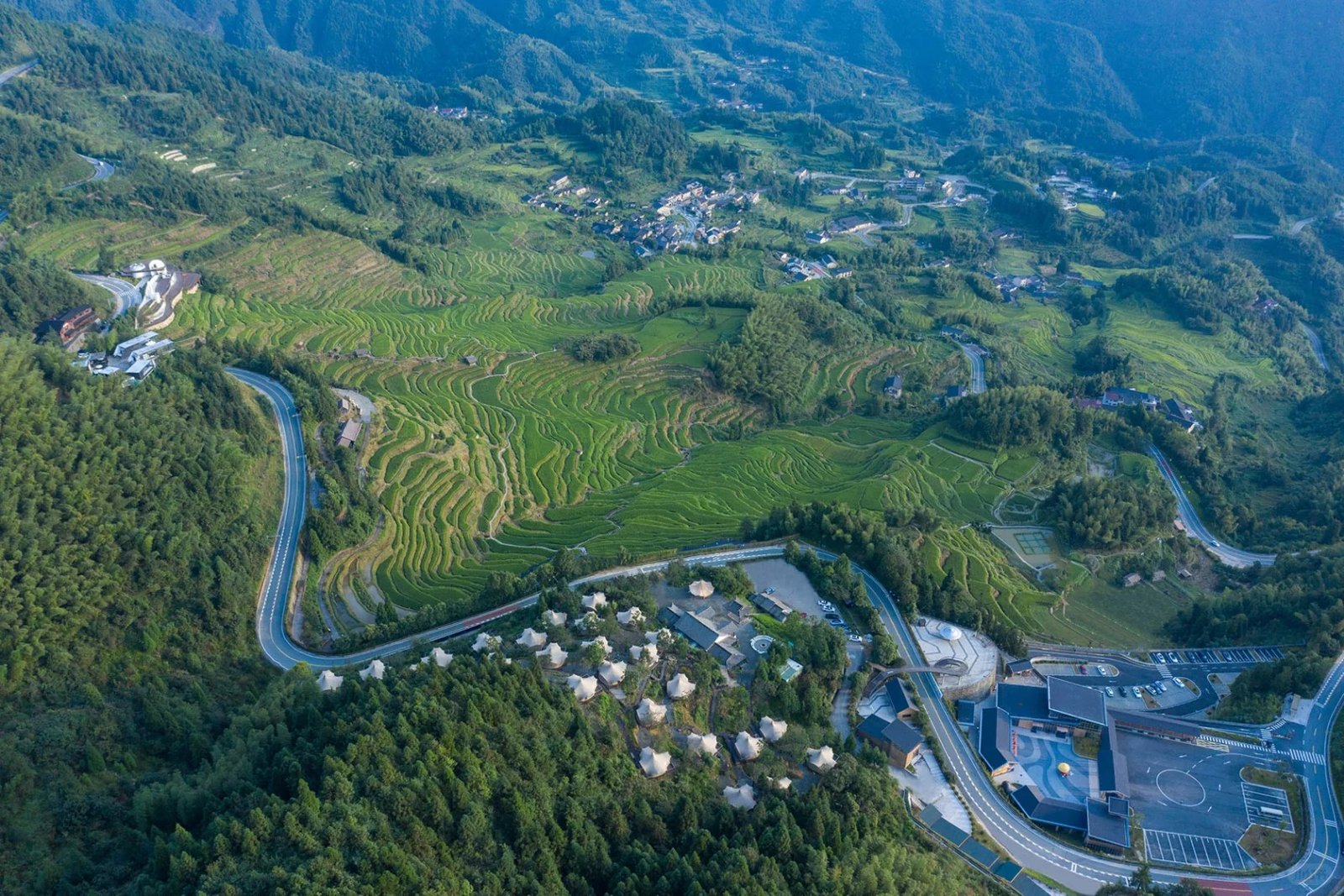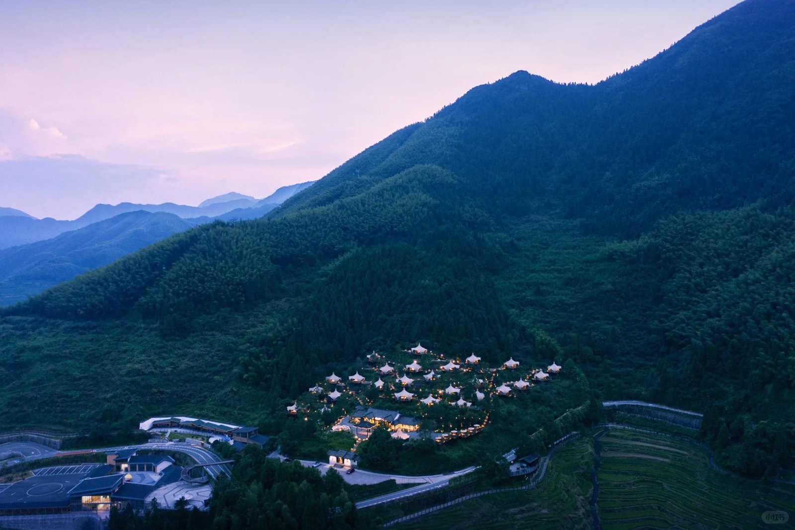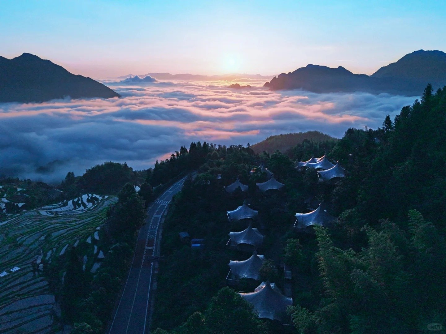 Guiye Campfire Campsite is situated within the 5A-level Yunhe Terraced Fields Scenic Area in Lishui City, Zhejiang Province. Adjacent to the Jiuqu Yunhuan Scenic Spot, the site lies on a southern slope at an altitude of 800 meters, offering a bird’s-eye view of the Yunhe Terraced Fields—where layers of rolling ridges are shrouded in surging clouds.