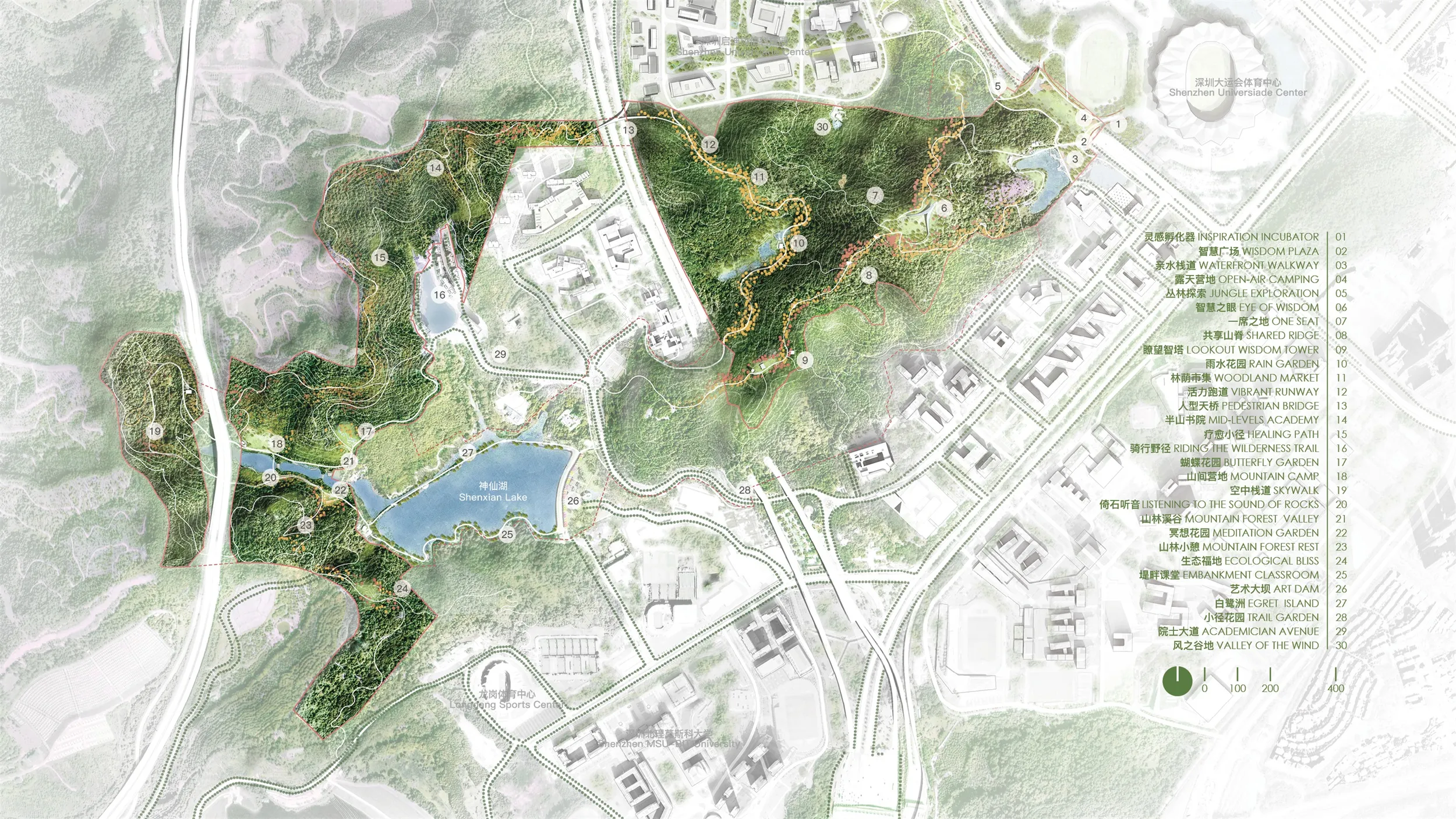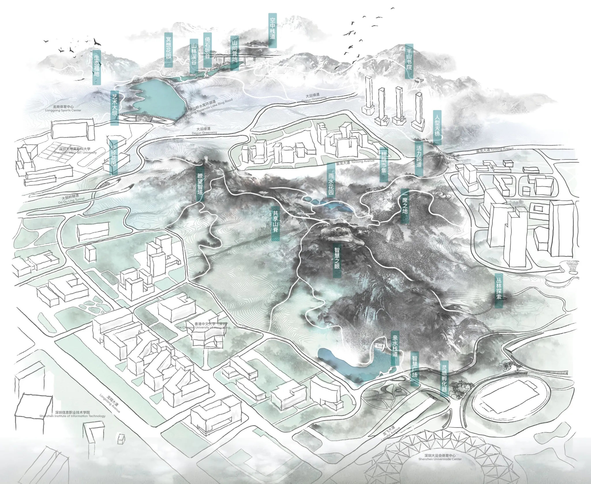 Located in the Dayun Center of Longgang District, Shenzhen, the Great Wisdom Park embraces the beauty of natural landscapes and integrates smart ecological concepts. The project aims to enhance the park’s accessibility, comfort, ecology, and cultural vitality, creating a distinctive park brand for the Longgang District.