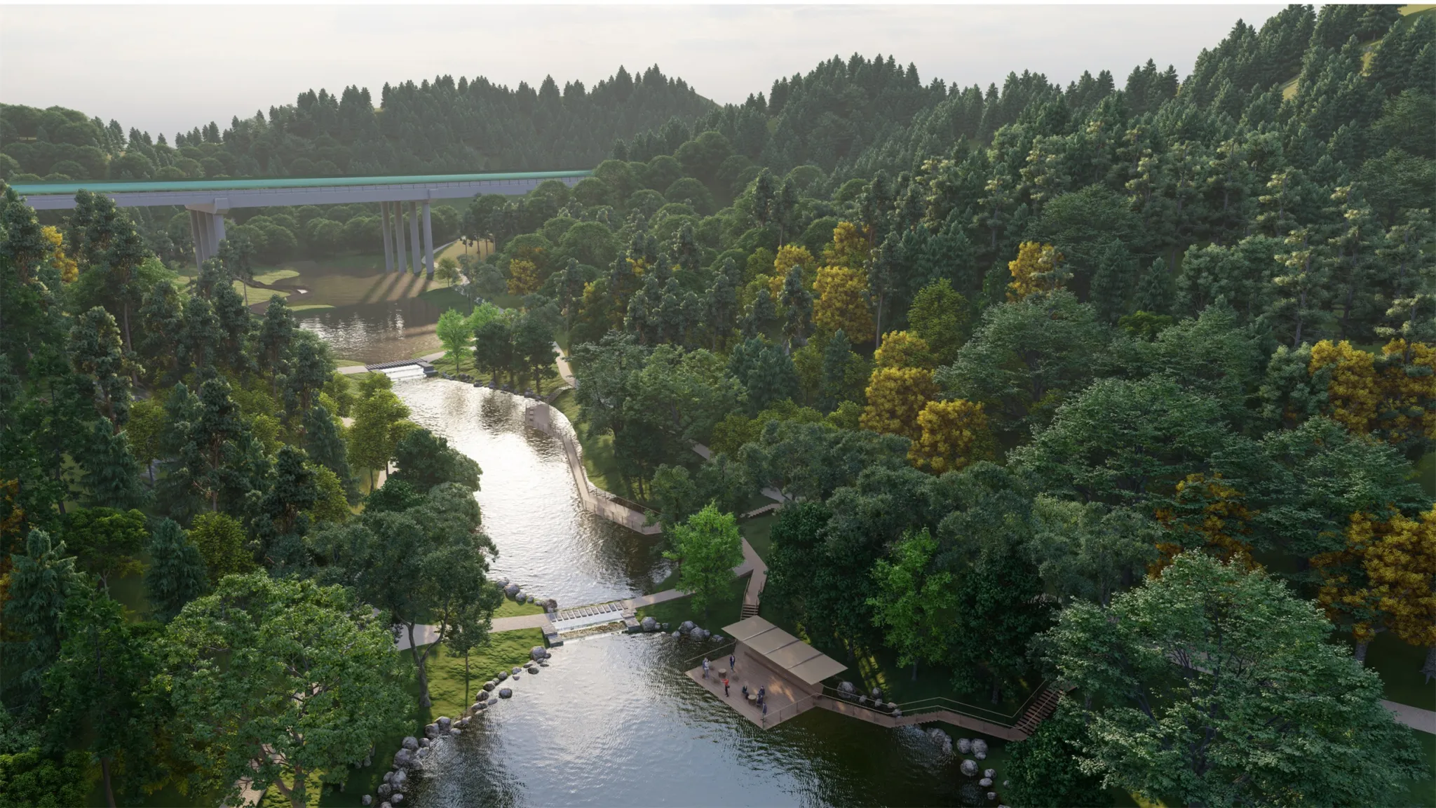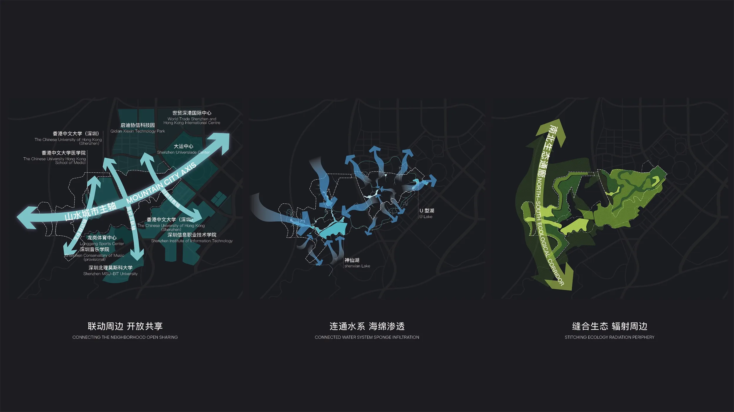 With a structure consisting of one axis, three belts, and multiple connections, the site links surrounding resources and water systems, establishes a richly layered ecological area, connects numerous viewing platforms and characteristic nodes, and lays out a comprehensive wisdom network.