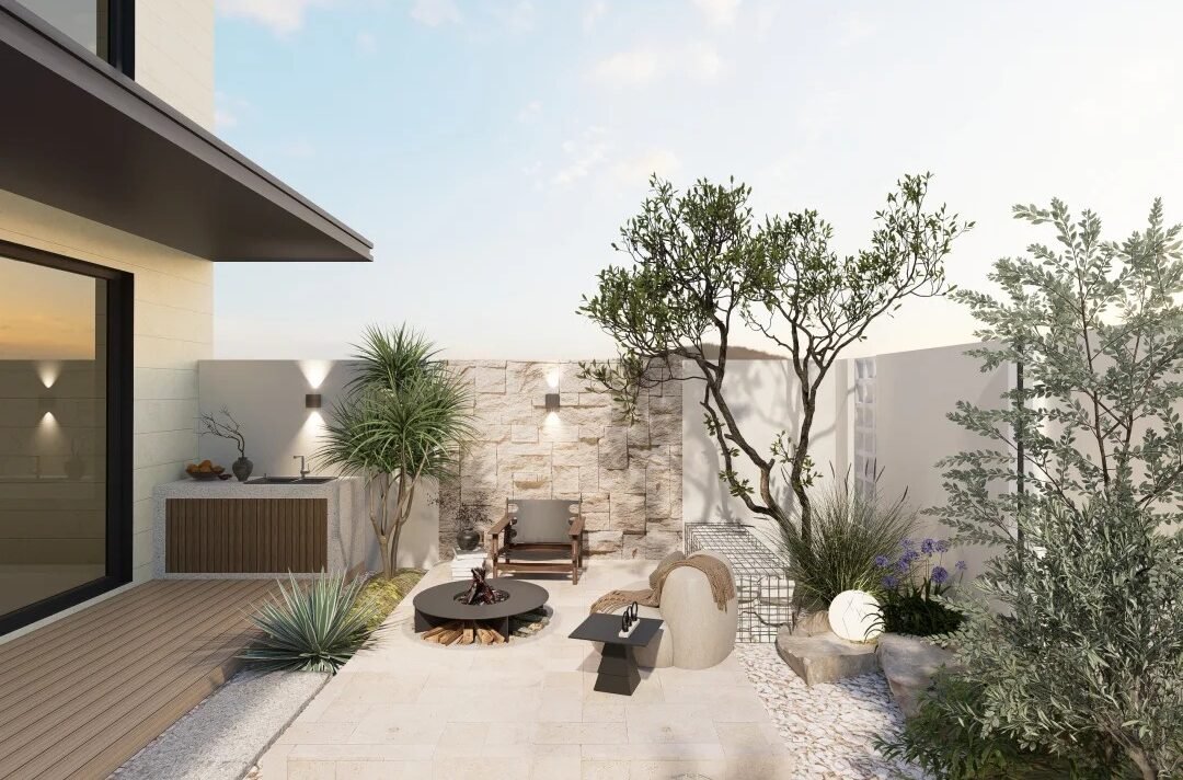Artistic, Minimalist, Quality, Light Luxury, Fashionable. The landscape design harmonizes with the interior finishing style, creating a cohesive interaction that fosters a comfortable, lightly luxurious..