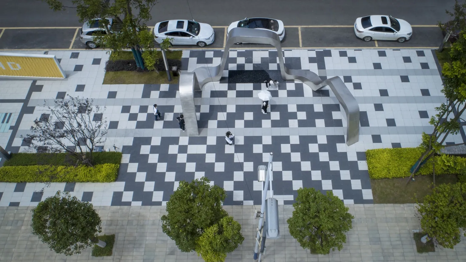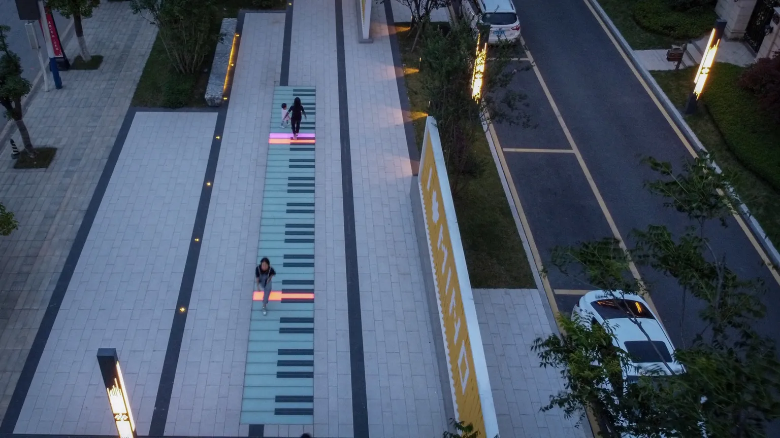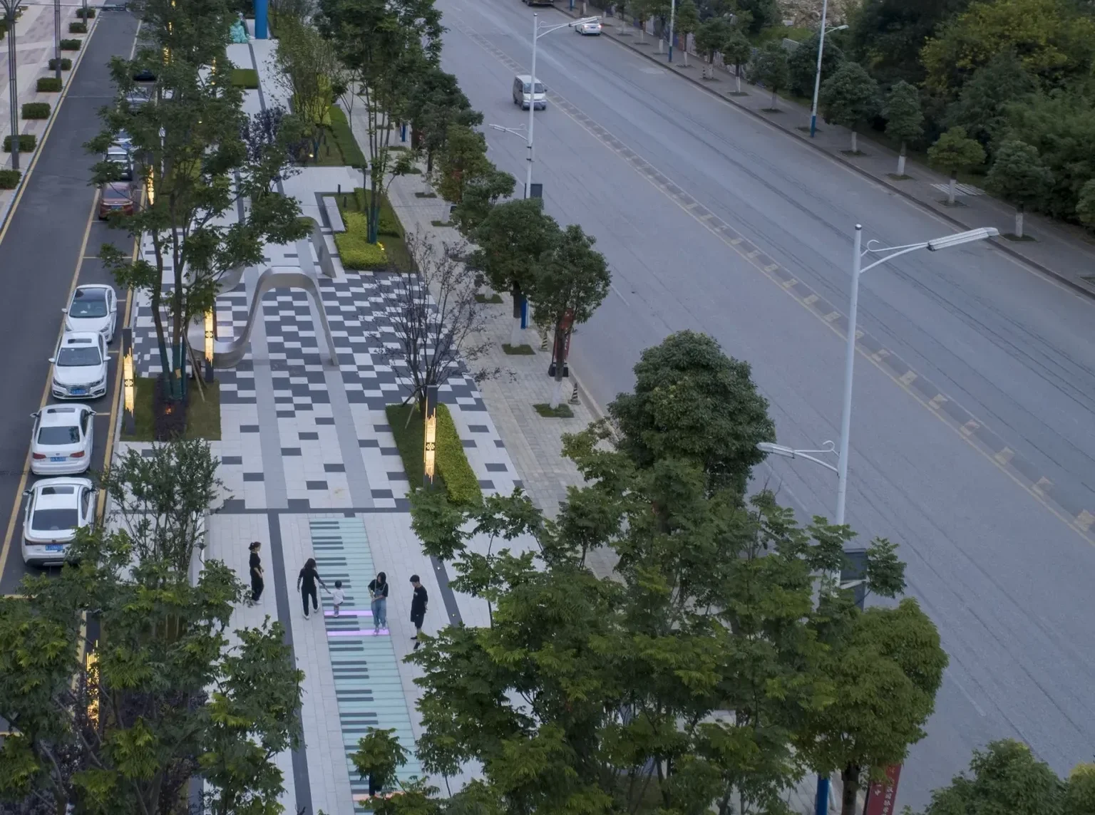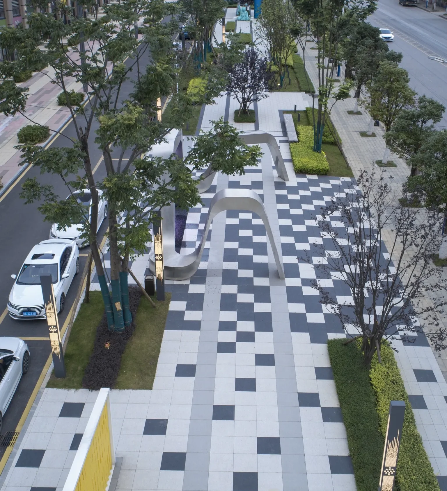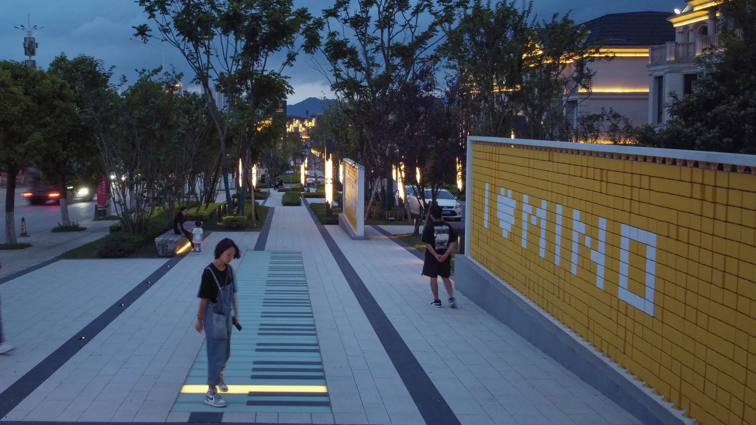 The ground interactive music piano installation and turning the fun wall further increase the fun of the space. We hope that through such field activities, people will be closer to each other in the process of participation.Tall trees provide comfortable greenery for the site.The neatly trimmed ground cover plants are beneficial for maintenance, and the addition of a glass landscape wall enriches the landscape level in the depth direction. The seat provides a small scene space for people to rest.