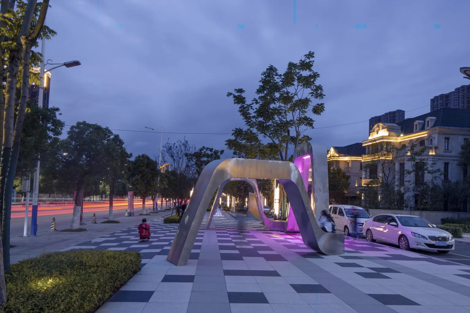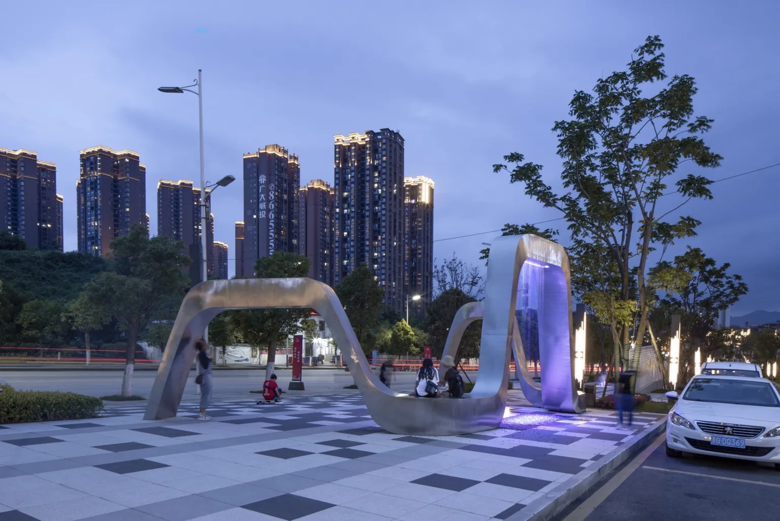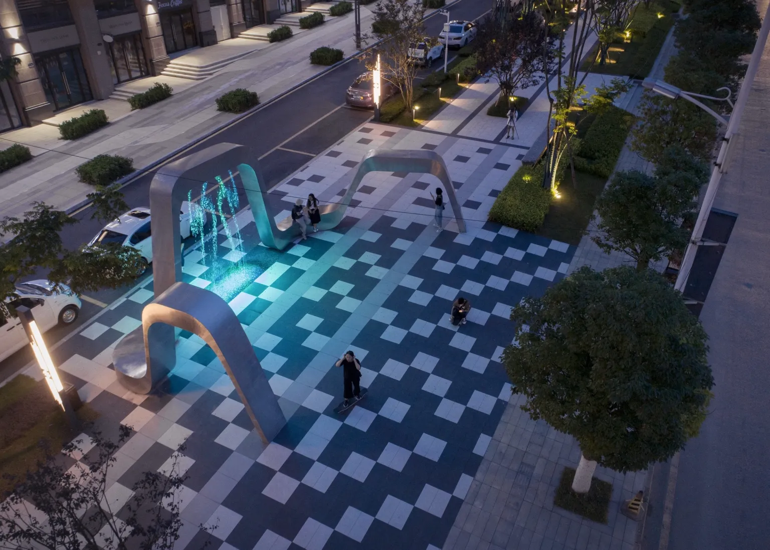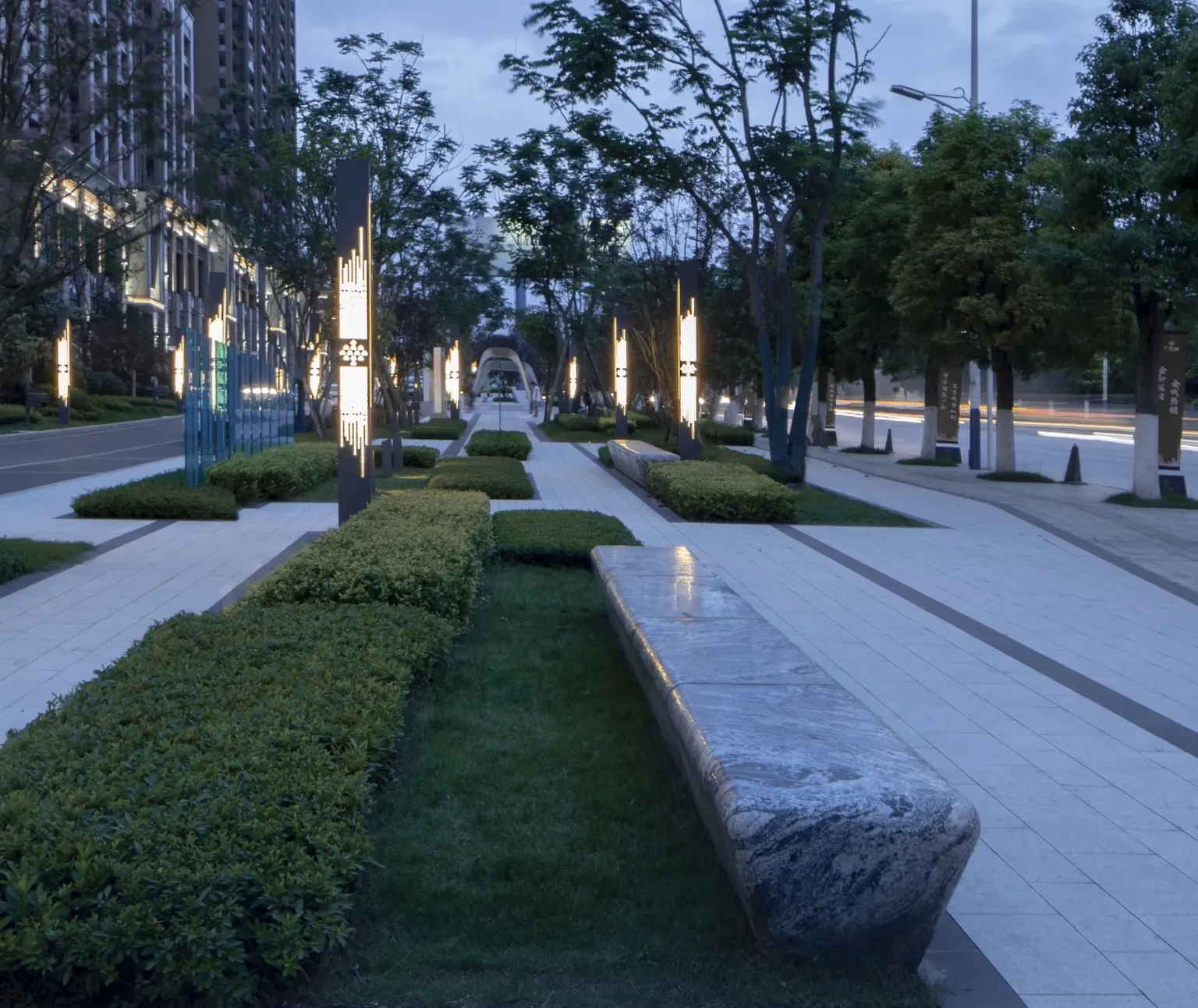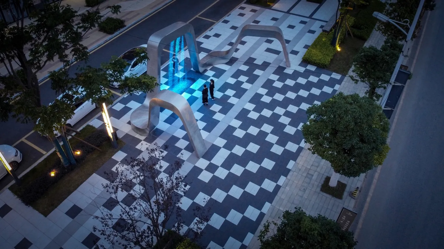 The numerical control flow art installation, as the core spot of the important node space, drives the site vitality and gathers popularity. The use of parameterized pavement on the ground strengthens the visual tension of the space and provides an interesting stay space.All imitation stone bricks are used in the venue to ensure uniformity of color, wear resistance, and avoid stone problems such as alkali recovery.The CNC water flow device shows different colors and patterns under the background of lights. At night, it becomes a theater of life in the community.