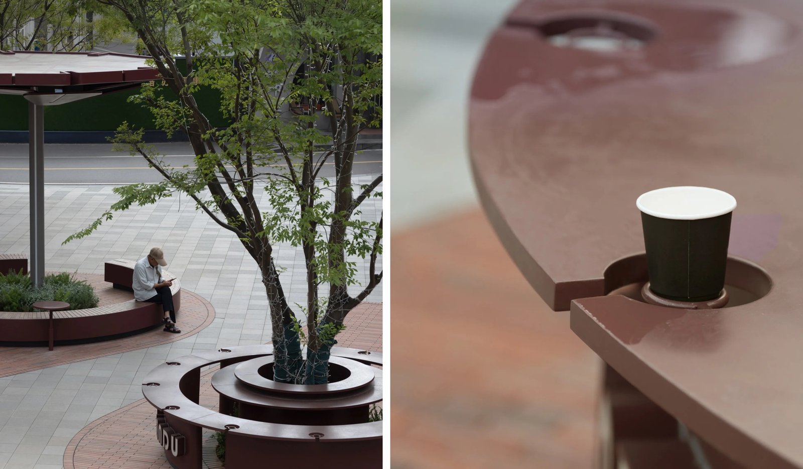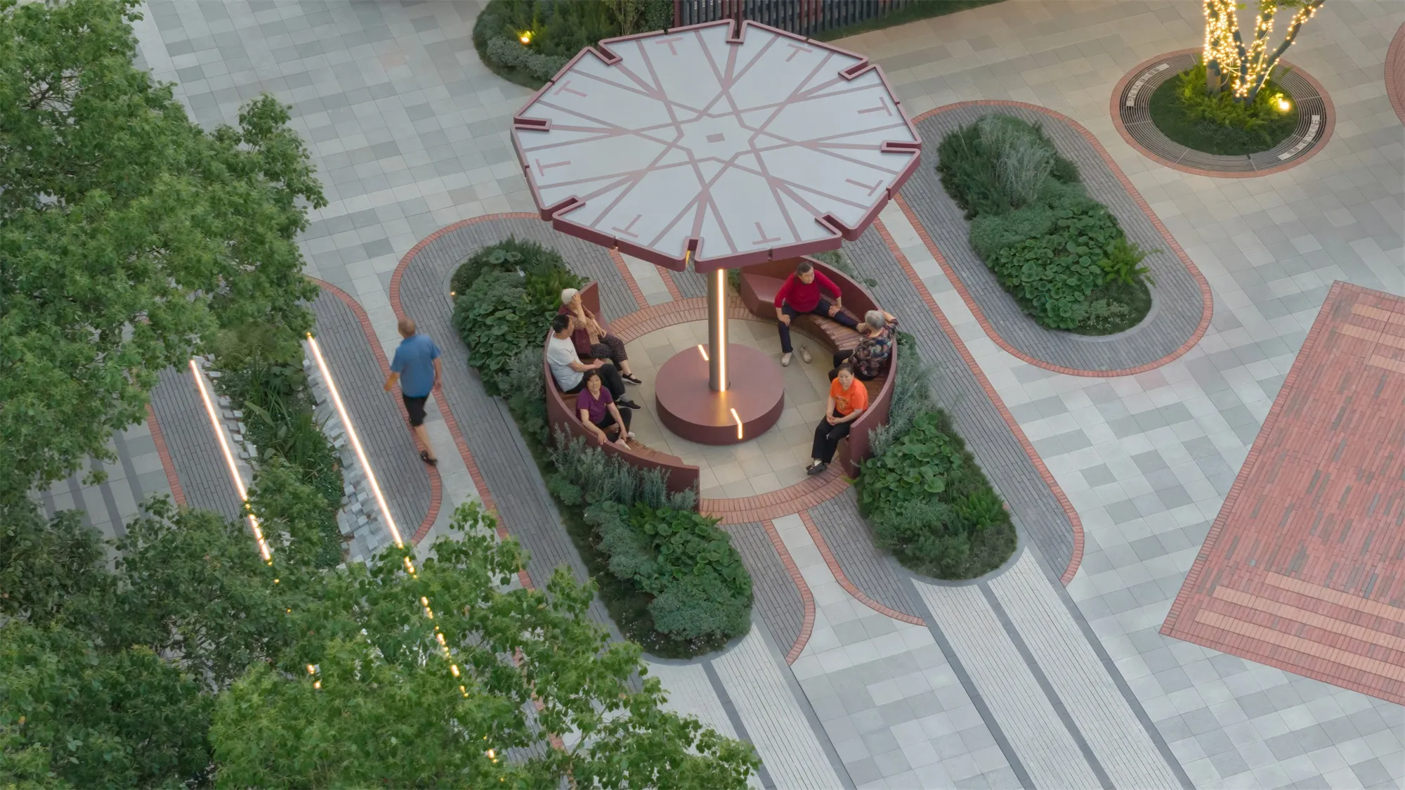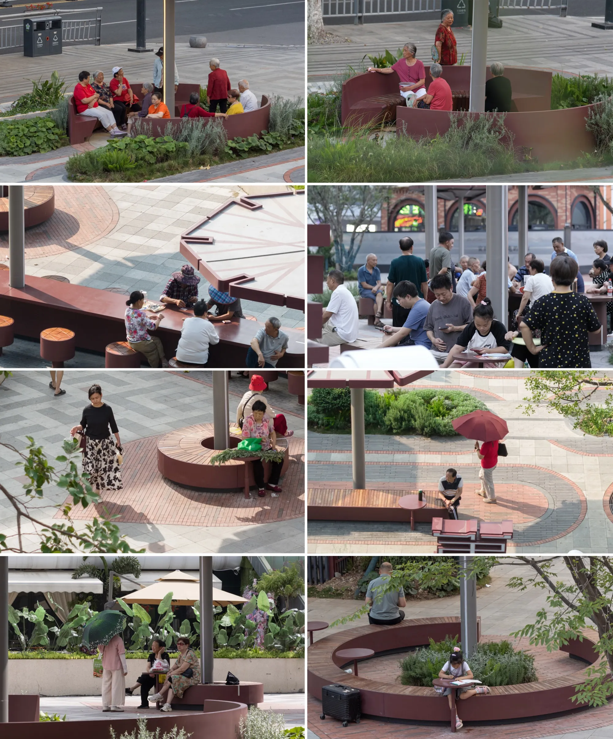 Rather than dividing the site with conventional functional zoning, the design distinguishes areas based on types of rest and socialization. Each seating arrangement enables a different way of pausing and engaging—multiple configurations create multiple possibilities.Seating beneath trees can function both as a counter space or as circular benches paired with side tables. The event plaza is designed to accommodate a variety of future activities. Chatting booths offer an ideal spot for groups of friends, while long communal tables encourage strangers to play cards or converse together. Shade umbrellas featuring decorative motifs inspired by Xiajiang culture enhance the stayability of the entire space.