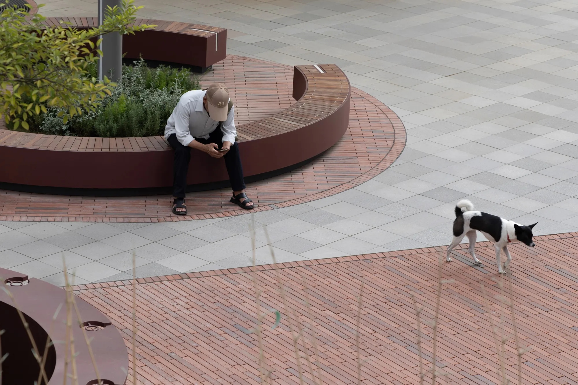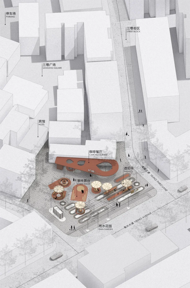 We must also integrate the spatial demands arising from localized commercial renewal. The northern edge of the plaza is lined with residential buildings dating back to the last century. In order to make the old neighborhood more appealing to young people—turning it into a future lifestyle destination—and to align with the upcoming youth apartment complex next door, the space has been repurposed into a “morning coffee, evening alcohol” café and restaurant. This functional shift naturally introduces new requirements for the site.However, it has also led to spatial conflicts during the transitional phase of renovation. The café operator desires an upscale and vibrant exterior atmosphere, while the presence of elderly residents gathering at the entrance clearly contradicts this vision. As a temporary solution, the café has delineated a makeshift outdoor dining area in front of its premises.Additionally, the operator has strongly requested dedicated parking spaces within the plaza—a contentious demand, as it would encroach upon the public functionality of the space for the broader community.
