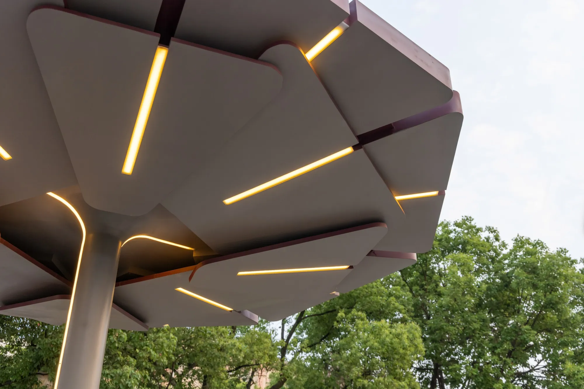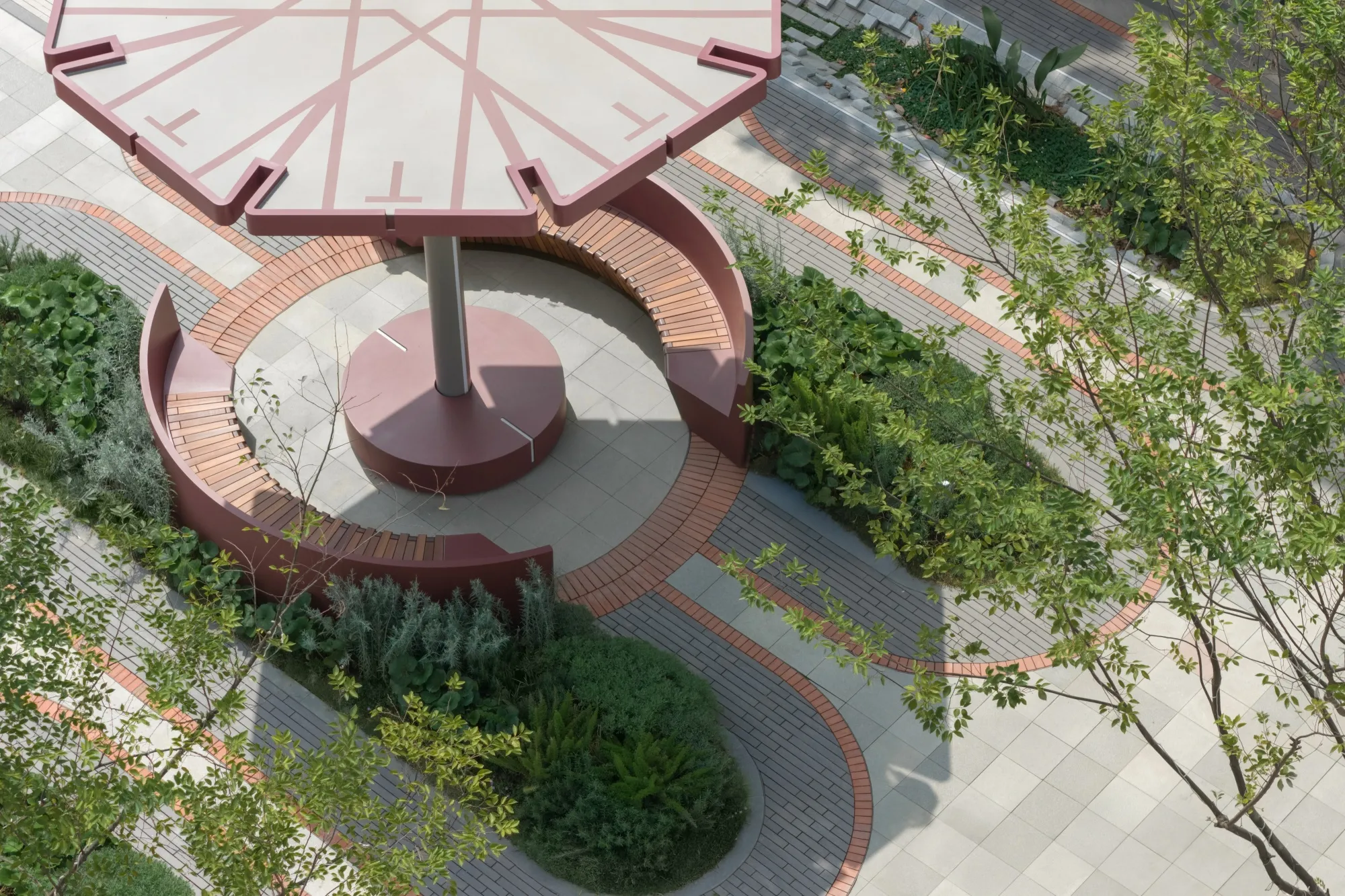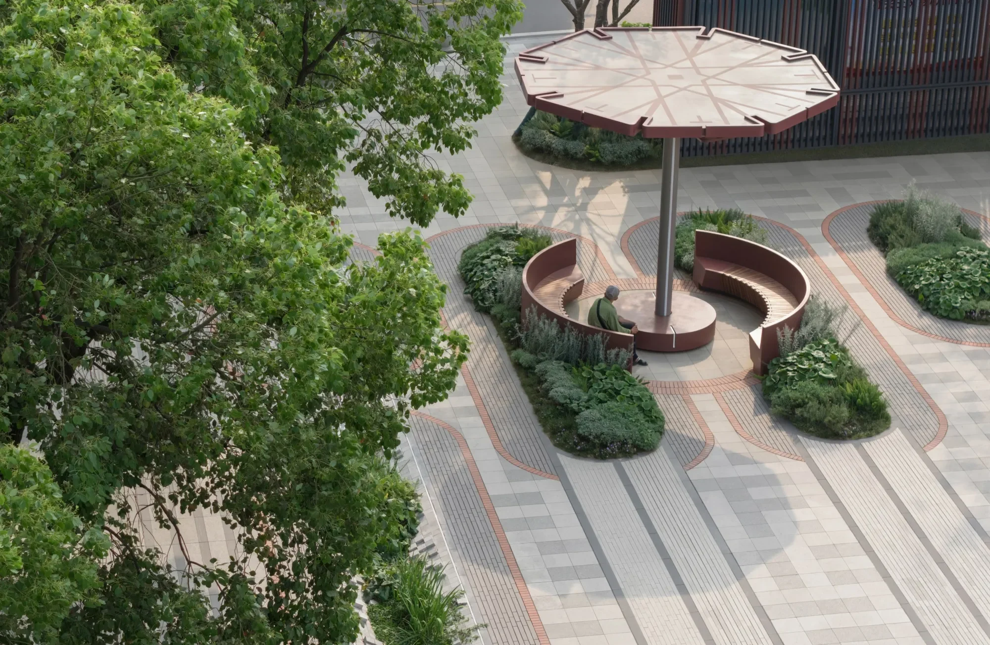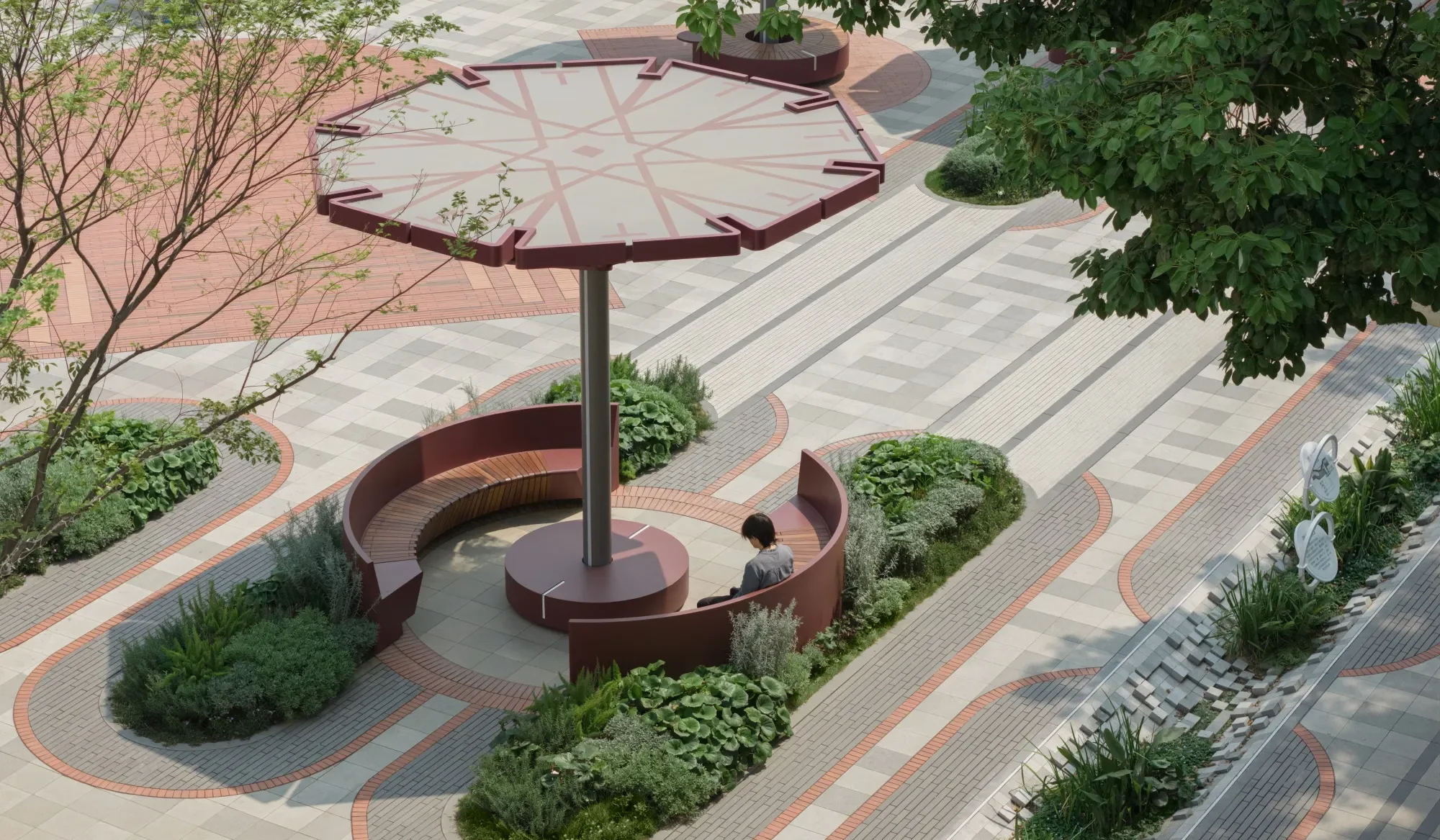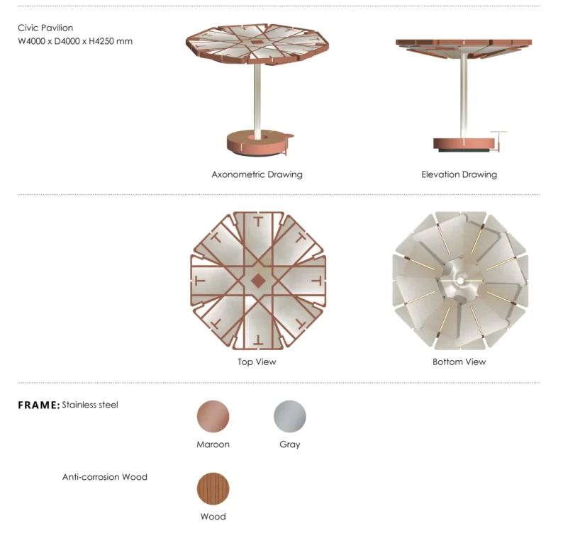 “The ‘Civic Pavilion’” provides essential shade for seating and garden areas through its aesthetically considered form, enhancing the appeal and comfort of the outdoor space.