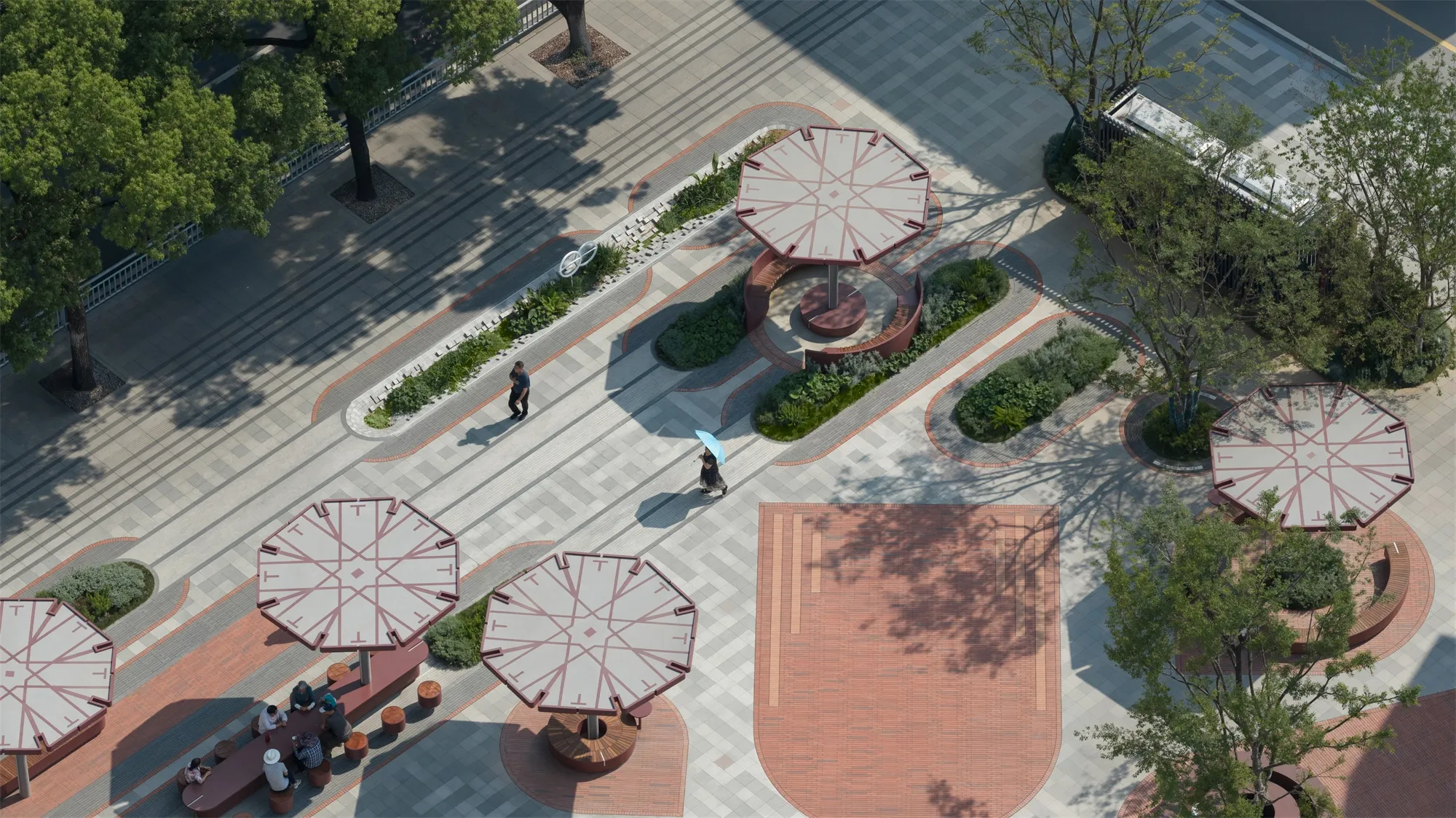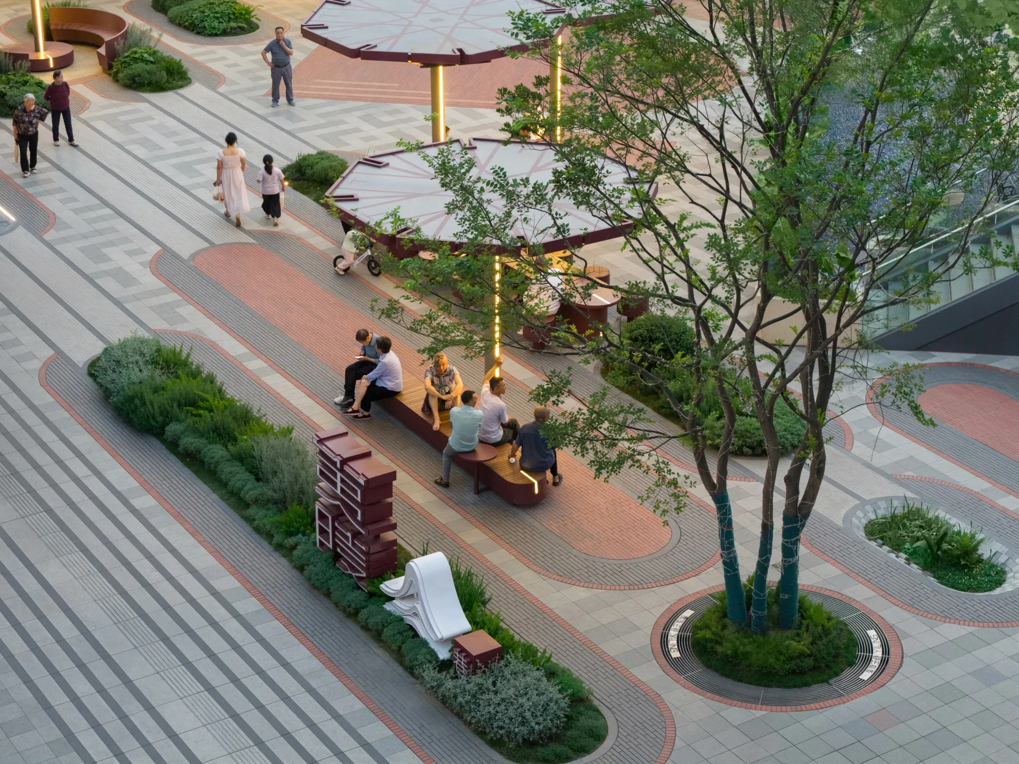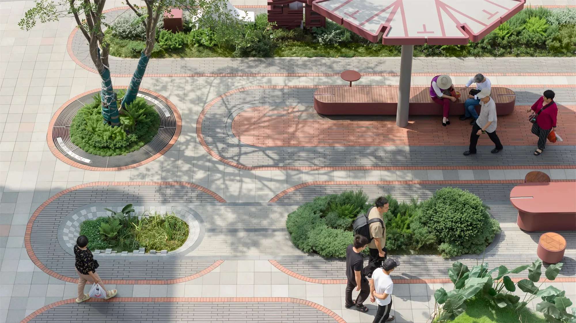 An inclusive urban living room should be equipped with “the seating of a living room, the red carpet of a living room, the garden of a living room, and the umbrellas of a living room.” It must offer spaces where the elderly can sit, rest, chat, or even play cards, as well as elegant coffee counters where young people can settle down, take photos, lean back, and enjoy refreshments. These resting areas should also provide ample shade, ensuring they remain inviting whether under the scorching summer sun or during cold, rainy winters.The ground surface incorporates distinctive textured paving that turns certain spots into unique zones—even stages—for activity and gathering.
