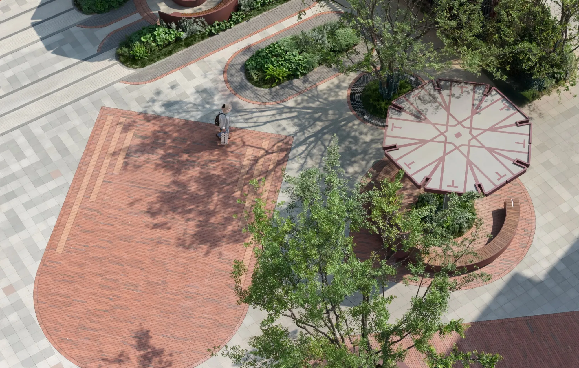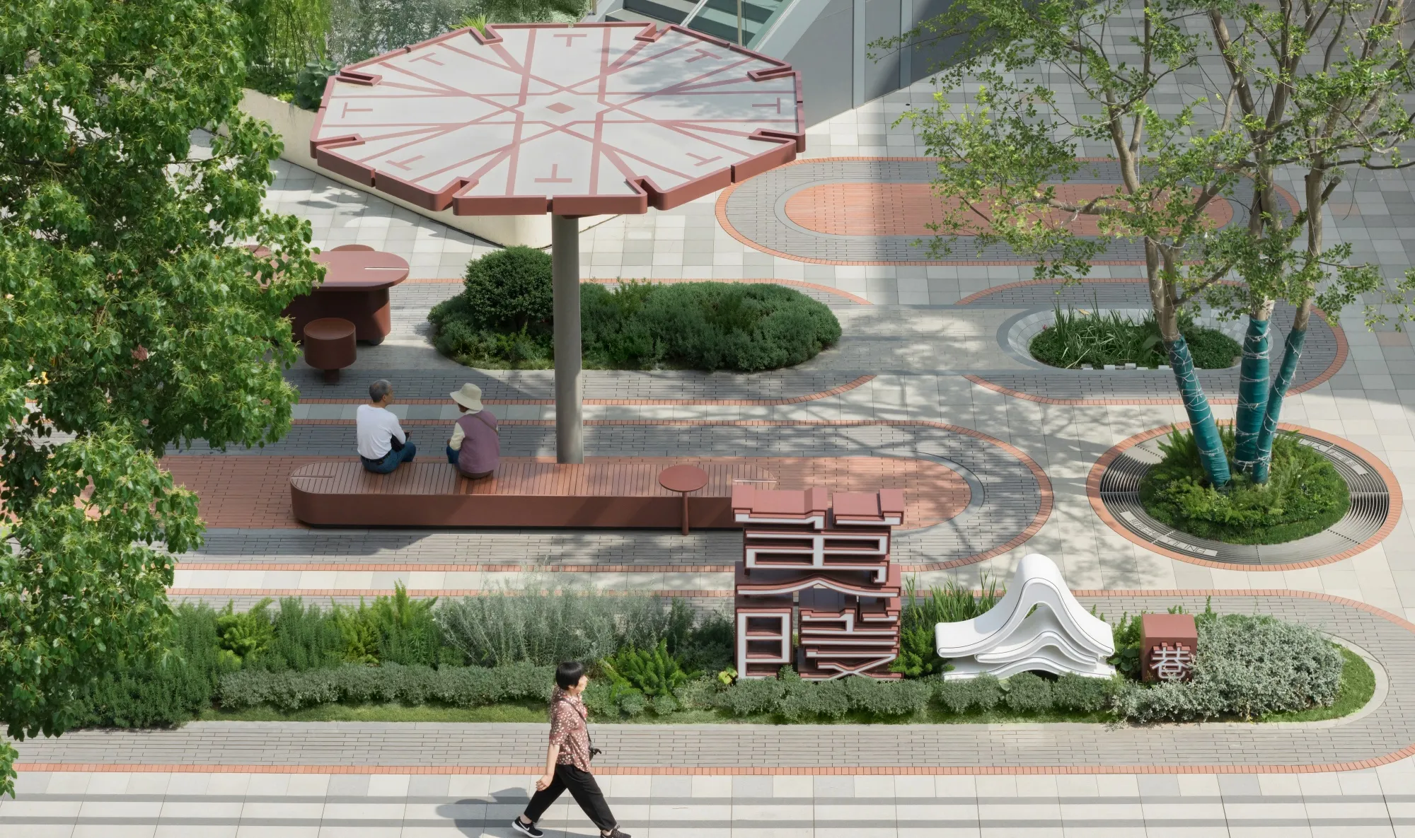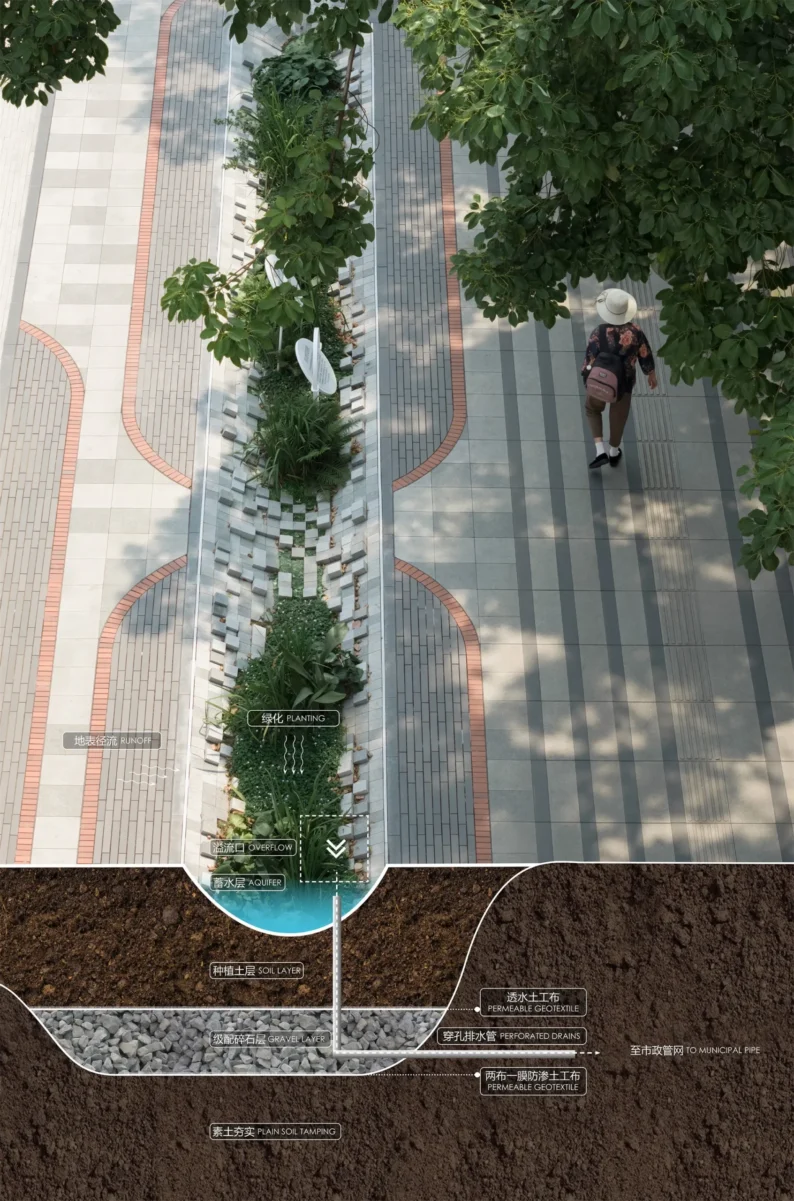 An inclusive urban living room should be equipped with “the seating of a living room, the red carpet of a living room, the garden of a living room, and the umbrellas of a living room.” It must offer spaces where the elderly can sit, rest, chat, or even play cards, as well as elegant coffee counters where young people can settle down, take photos, lean back, and enjoy refreshments. These resting areas should also provide ample shade, ensuring they remain inviting whether under the scorching summer sun or during cold, rainy winters.The ground surface incorporates distinctive textured paving that turns certain spots into unique zones—even stages—for activity and gathering.