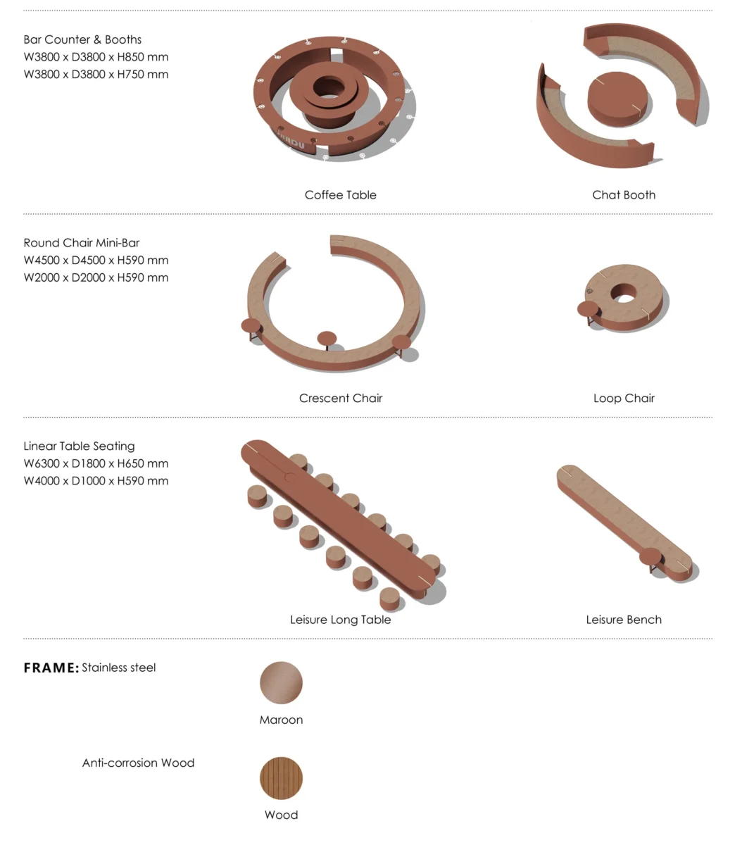 2) Diverse and Versatile Urban Living Room Furnishings: Tables, Chairs, Bar Counters, Booths, Umbrellas, “Red Carpets,” and Gardens