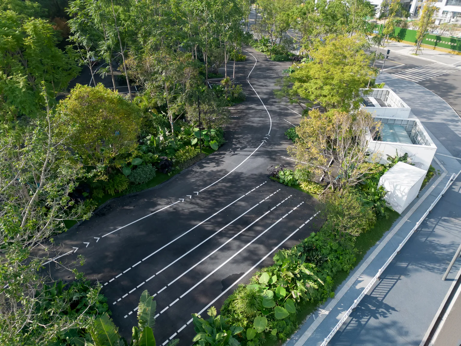 Set up car, pedestrian entrance, people and vehicles. In the process of driving, the road width is partially enlarged to facilitate parking and wrong vehicles. This area is considered to be one of the Mini bus connection points of Luhu Eco-City in the future planning. Light plate truss is used at the entrance to replace the security pavilion at the traditional parking entrance, which is convenient for management and control, and can also be used in the overall scenic area in the future.