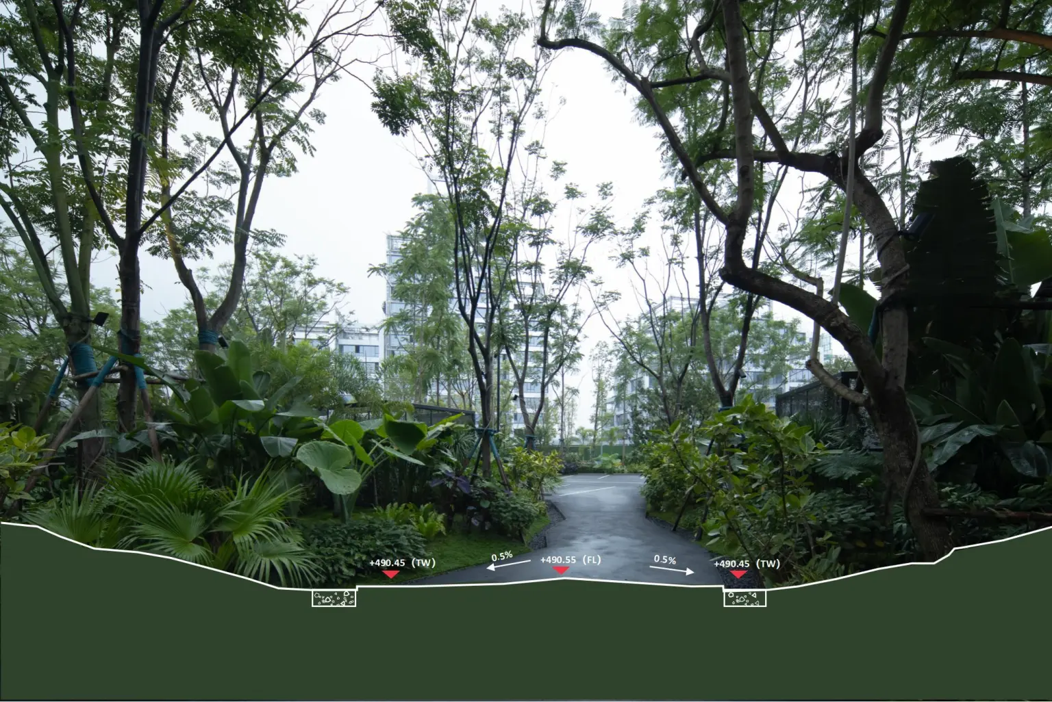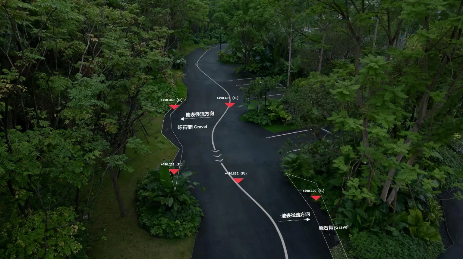 Using plants to blur the boundary, the norms are integrated into the site. Gravel belts ranging from 300mm-500mm are set on both sides of the road to allow rainwater to return to the green space, adjust the ground temperature and achieve green irrigation. During the rainstorm, the excess water on the road overflows and flows into the water for the purpose of drainage.